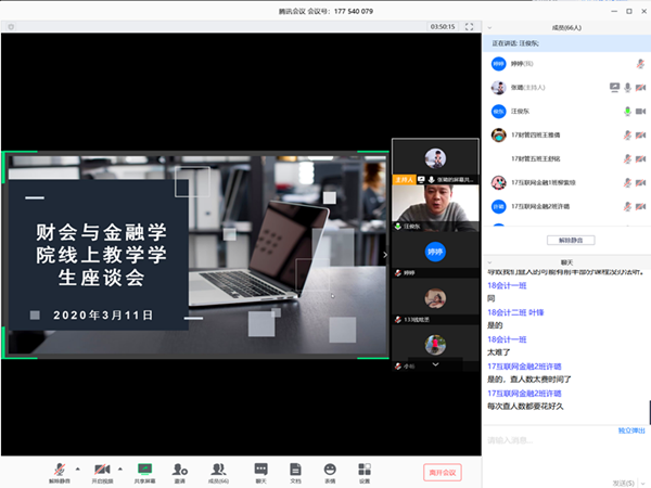 本网讯(通讯员:孙马莉)在当前新冠肺炎疫情防控形势仍然复杂严峻的情况下,根据教育厅及学校工作安排,财会与金融学院为及时掌握线上教学运行的实际情况,进一步提高线上教学质量,真正做到线上线下同等效果,3月11日下午,财会与金融学院通过腾讯会议平台组织召开疫情期间线上教学学生座谈会,财金学院执行院长汪俊东、副院长蔡冬梅、院长助理张璐,及相关教学管理人员、全体班级学生代表参与此次座谈会,会议由张璐主持。